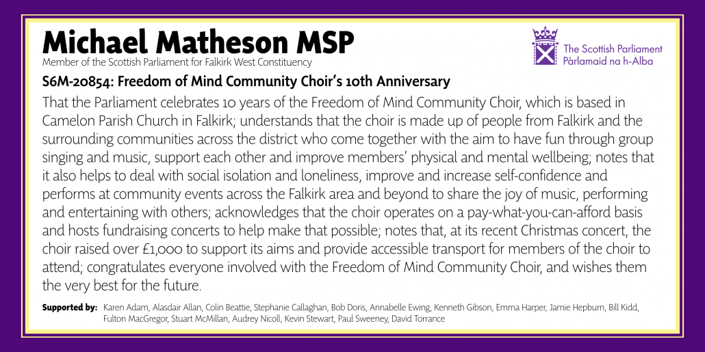 “Delighted to celebrate the tenth anniversary of the Freedom Of Mind Community Choir with this motion to Parliament.
